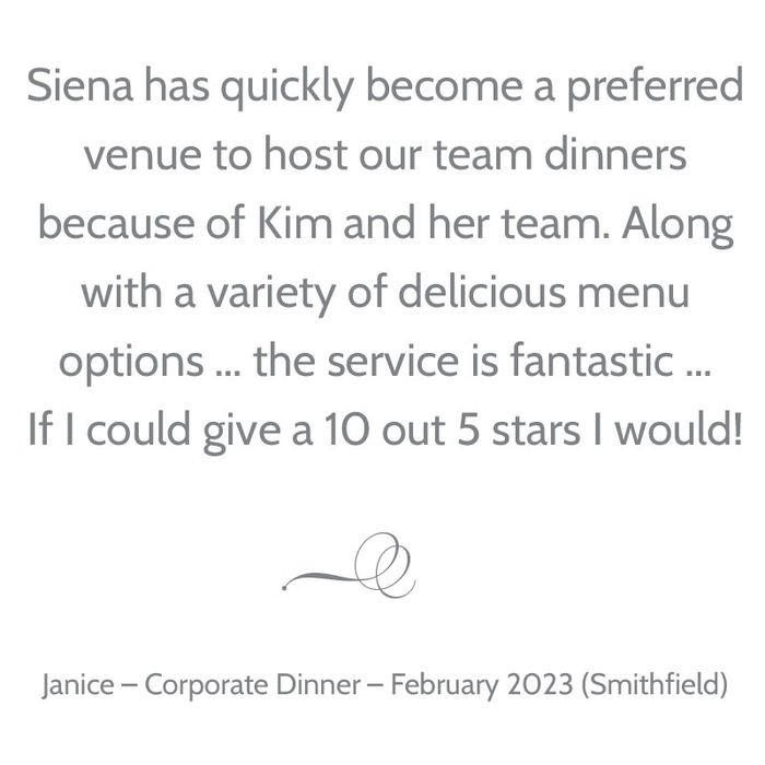 Siena is an ideal choice for your next social or corporate event. From intimate gatherings to business dinners and social events, our private rooms will accommodate all of your event needs. Whatever the occasion, at Siena we will make it truly memorable.